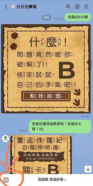 活動內容:於「日月光廣場Lline@官方帳號」傳送「現場Q&A指定文字及答案」,即可參加「LINE@抽獎機會乙次」!共5次機會,有機會獲得「土城秀泰影城電影票」。日月光廣場LINE@傳送門:https://lin.ee/V9bf96L